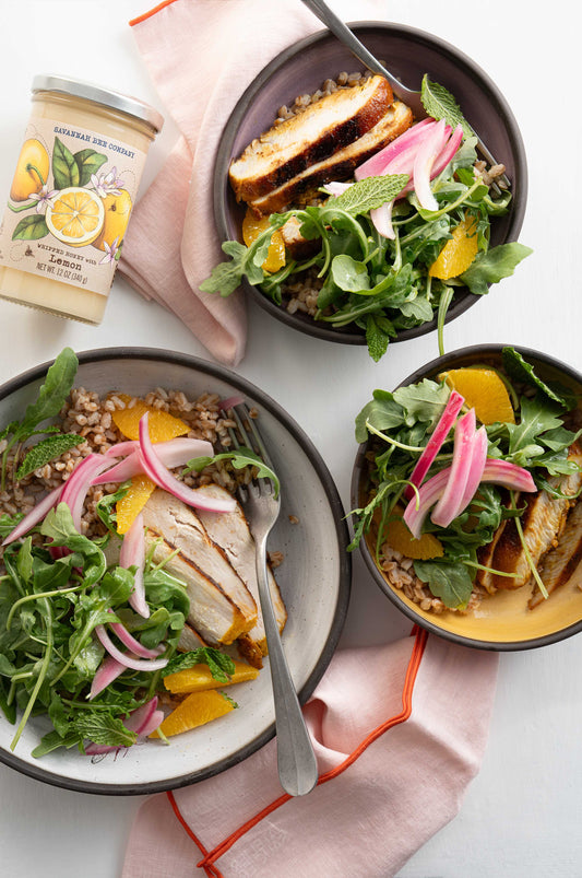 This farro grain bowl is sure to satisfy every taste bud with glazed turmeric chicken, peppery arugula, tangy pickled onions, and sweet citrus. Our lemon whipped honey ties it all...
