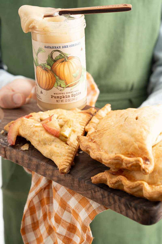 These easy pumpkin spice honey-flavored apple turnovers with pie crust are the perfect easy fall treat. A simple apple pie filling flavored with our Pumpkin Spice Whipped honey transforms grocery...